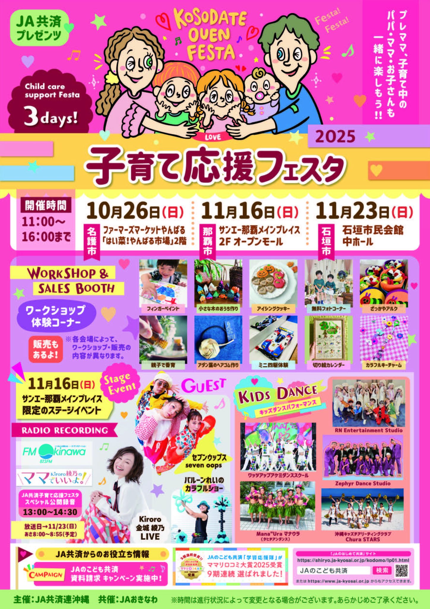 金城綾乃「JA共済プレゼンツ 子育て応援フェスタ2025」に出演! 2025.09.28 INFORMATIONインフォメーション 金城綾乃が『JA共済プレゼンツ 子育て応援フェスタ』に出演します。 『JA共済プレゼンツ 子育て応援フェスタ』 【公開収録日時】2025年11月16日(日)13:00〜 【会 場】サンエー那覇メインプレイス 【出 演】金城綾乃(Kiroro)、セブンウップス