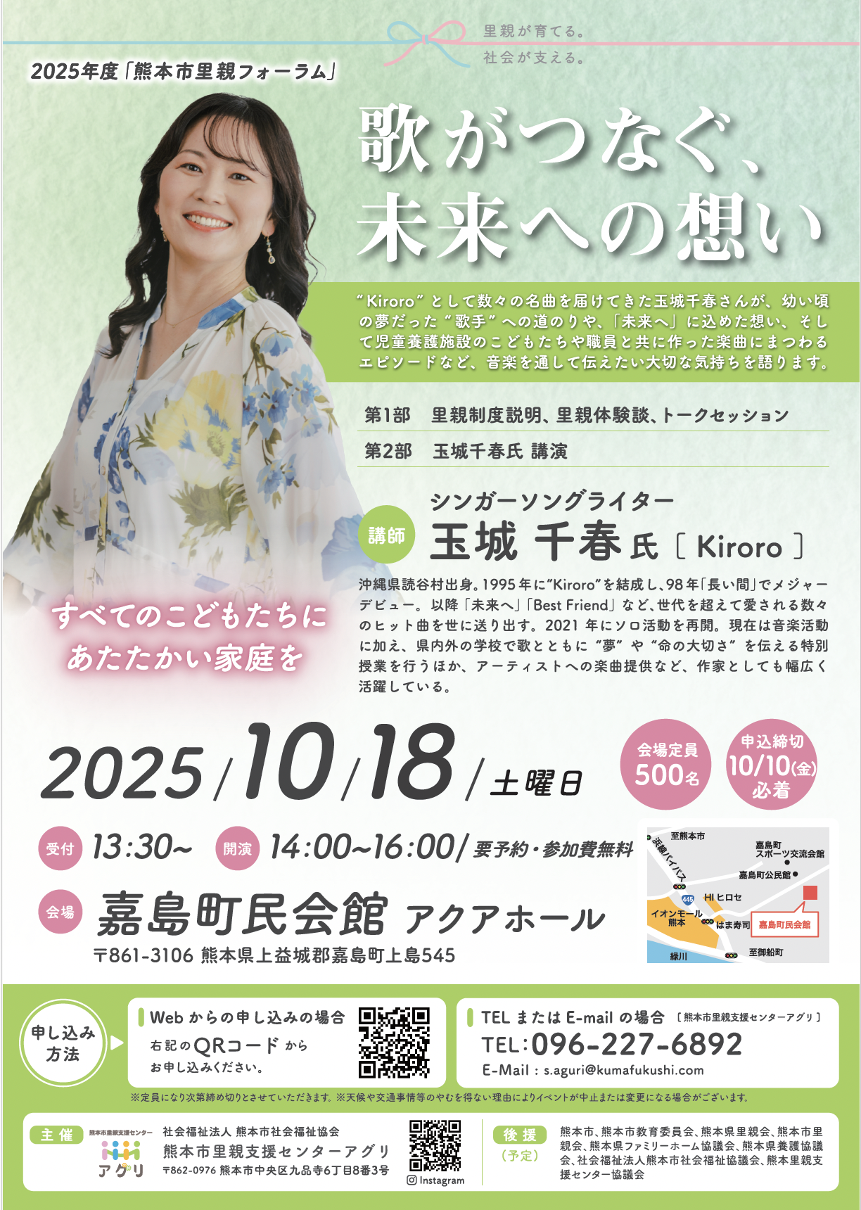 Kiroroとして『未来へ』『Best Friend』など世代を超えて愛される数々のヒット曲を世に送り出された、シンガーソングライター玉城様をお招きし、児童養護施設のこどもたちや職員と共に作った楽曲にまつわるエピソードなどご講演いただきます。